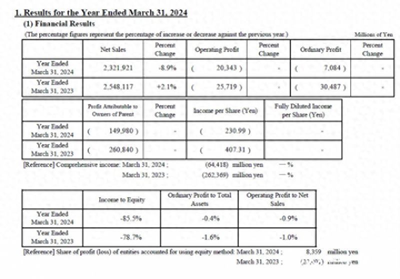 根据夏普财报,单就上季(2024年1-3月)情况来看,夏普合并营收较去年同期下滑4.1%至5572亿日元(约合人民币257.8亿元),营损额为167亿日元(约合人民币7.73亿元)、本业为3季来首度陷入亏损,合并净损额达1520亿日元(约合人民币70.32亿元),连续第三季陷入亏损。