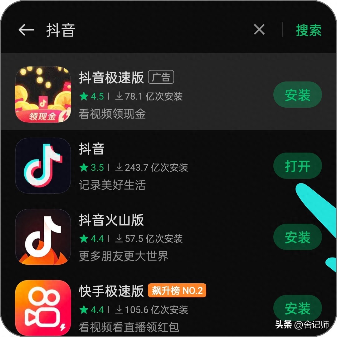 第二步、搜索结果显示抖音后面是“打开”二字,说明已是最新版无需升级,如果有“升级”二字点击升级即可。