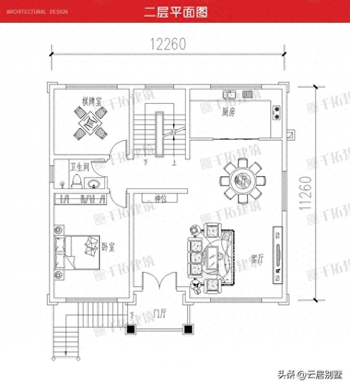 二层平面功能:朝南一间老人房,给父母住,阳光通透,距离客厅有一定距离,避免喧嚣,嘈杂。朝北有一间棋牌室,逢年过节的,可以在这打打牌,娱乐下消遣时间;客厅面积大,宽敞,阳光很充足,厨房餐厅一体设计,起居生活更便利。