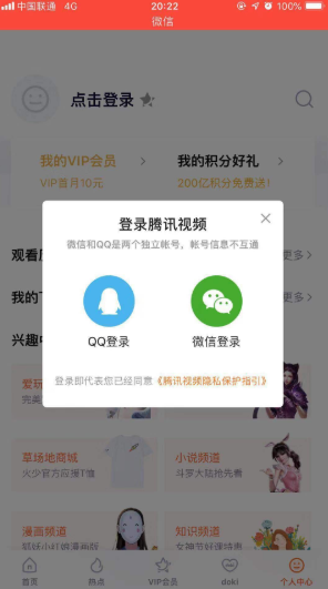 1.使用手机登录的用户,只需在手机下载一个腾讯视频APP,之后打开APP点击右下方“个人中心”,进入页面后点击“点击登录”,这时会弹出QQ和微信两种登录渠道,你择其一便可实现账号共享。