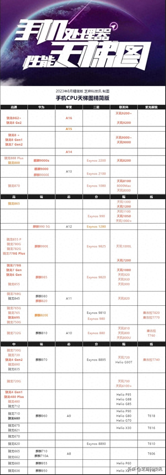 处理器作为一部智能手机最核心的硬件,决定着用户体验的方方面面,包括流手机流畅度、游戏能力、网络支持、拍摄表现等等。所以无论是看手机性能排名,还是买新手机比价格等都有参考价值。话不多说,以下是芝麻科技讯制作的手机CPU天梯图 2023 年 8 月最新精简版。
