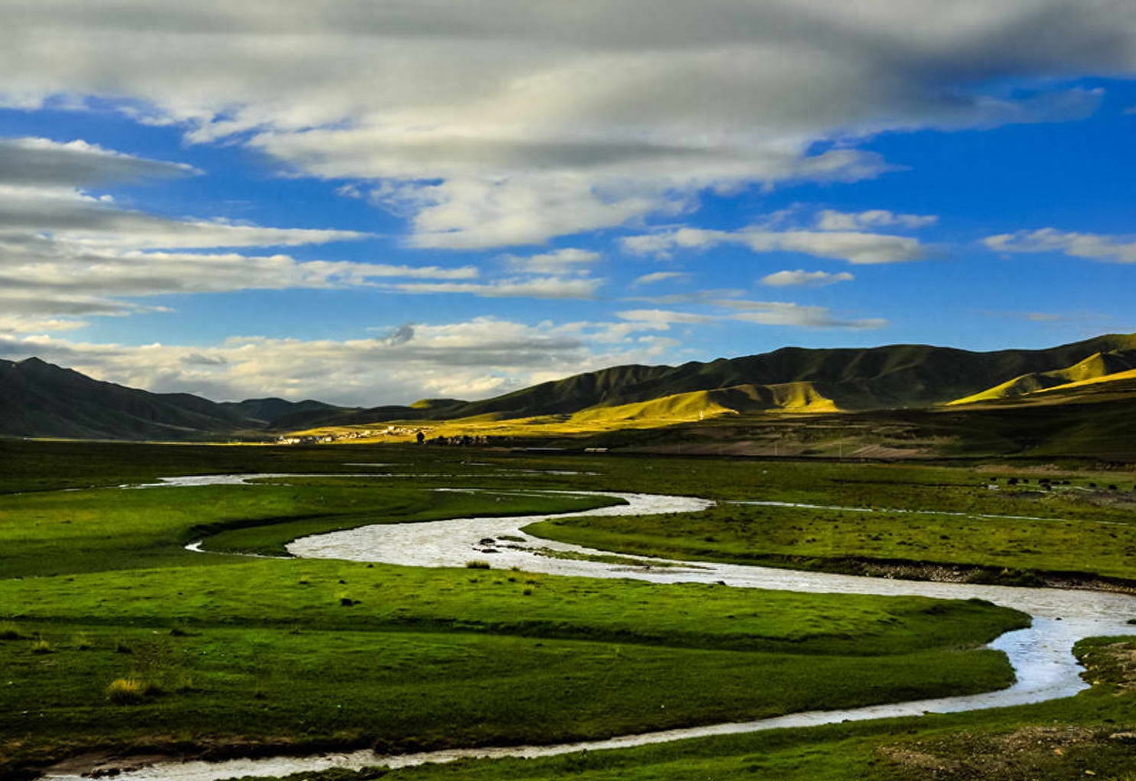 在这里可以看到清澈的小河缓缓流淌,在阳光下泛着银光。河边有各种颜色的野花,有红的、黄的、紫的,像一条彩带。河水里还有鸳鸯、野鸭等水鸟,嬉戏玩耍。河岸上有牛羊马匹在吃草,悠然自得。远处的山峦苍翠,白云飘飘,构成了一幅美丽的画卷。