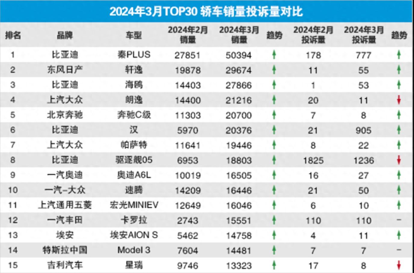 具体来看,在在2024年3月TOP30 轿车销量投诉量量排名榜单中,让人震憾的是来自第一名的秦PLUS车型,它在3月的销量高达了5万多辆,而投诉量也来自了777宗,投诉较2月上涨了6倍多,这两个数数既是对其市场地位的肯定,也是对其产品和服务质量的严峻考验。