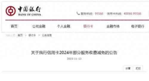 最新发布涉及信用卡减费让利公告的为中国银行。11月13日,中行发布《关于我行信用卡2024年部分服务收费减免的公告》,对部分信用卡服务费进行减免。减免项目包括中银系列产品持卡人使用自有资金进行柜台取现手续费、转账转出手续费、信用卡补发卡/损坏卡/提前换卡的服务费等。中国银行表示,本次部分费用减免为阶段性费用优惠,时间为2024年1月1日至12月31日。这已经是中行第二次发布信用卡减费让利的公告,此前该行于10月30日发布公告称将综合提升信用卡服务质效,将在11月底前提升容差服务限额至1元。