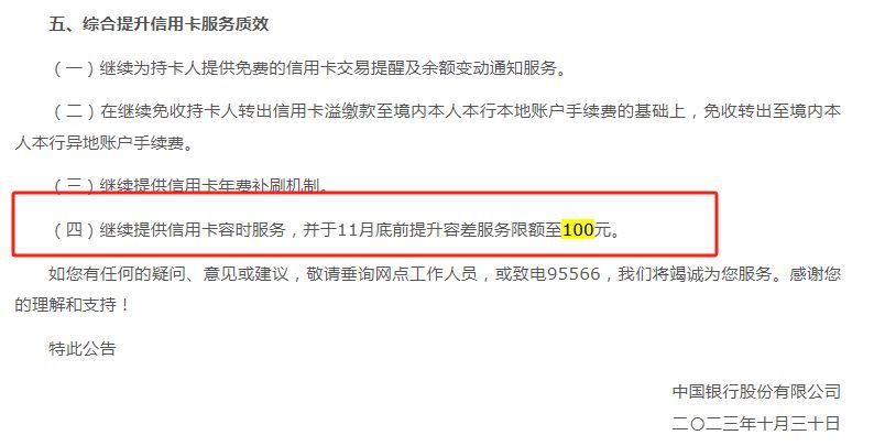 其中,10月30日,中国银行便公告称综合提升信用卡服务质效,将在11月底前提升容差服务限额至1元。