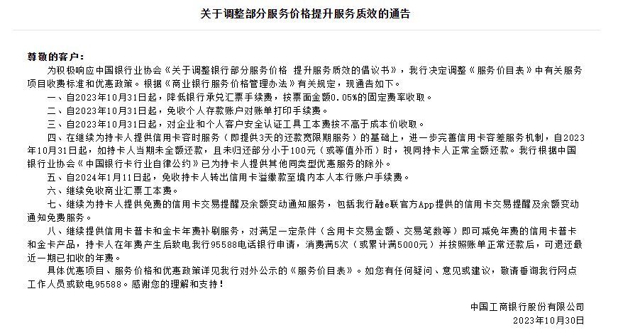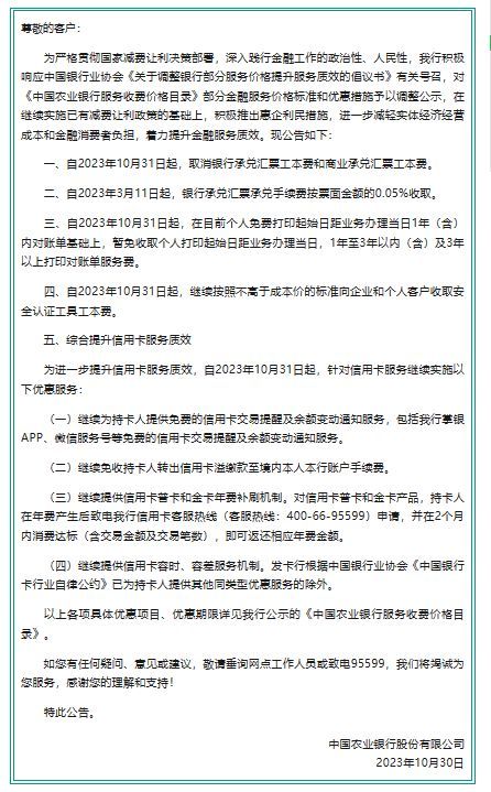 农行公告指出,自2023年10月31日起,继续为持卡人提供免费的信用卡交易提醒及余额变动通知服务;免收持卡人转出信用卡溢缴款至境内本人本行账户手续费;继续提供信用卡普卡和金卡年费补刷机制;继续提供信用卡容时、容差服务机制。
