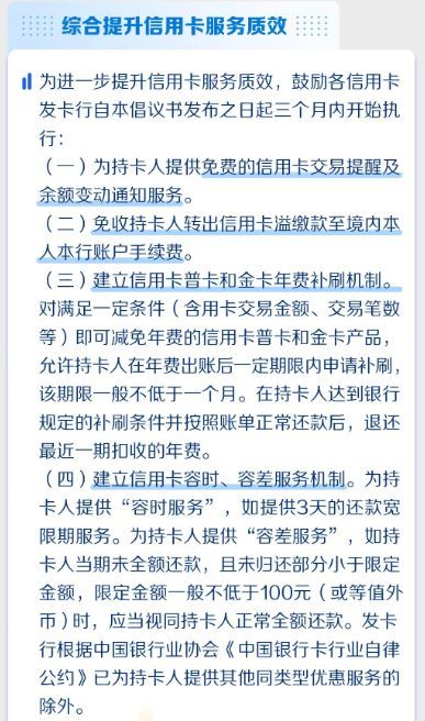 关于“建立信用卡容时、容差服务机制”,《倡议书》提及,鼓励各信用卡发卡行为持卡人提供容时服务,如提供3天的还款宽限期服务。同时,为持卡人提供容差服务,如持卡人当期未全额还款,且未归还部分小于限定金额,限定金额一般不低于1元(或等值外币)时,应当视同持卡人正常全额还款等。
