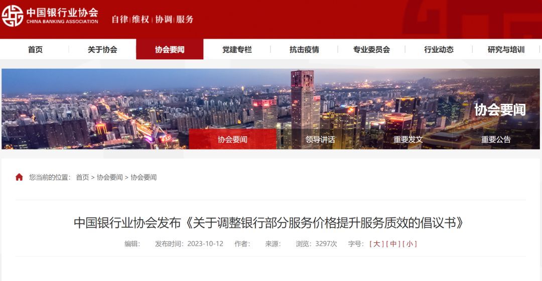 10月12日,中国银行业协会官网发布《关于调整银行部分服务价格提升服务质效的倡议书》,主要有五点内容: