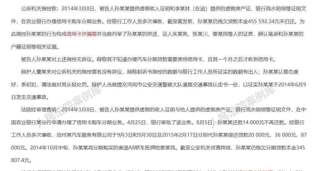 2014年3月8日,被告人孙某某提供虚假收入证明和李某林(在逃)提供的虚假房产证、银行流水明细等证明文件,在农业银行办理信用卡购车分期业务。经银行工作人员多次催收,截至案发前,孙某某仍拖欠贷款本金455 592.34元未归还。头此指控孙某某的行为构成信用卡诈骗罪并当庭列举了孙某某的供述,证人朱某英、张某川、娄某民等人的证言,辨认笔录和孙某某的户籍证明等相关证据。