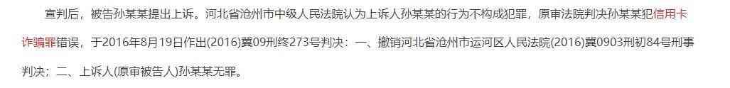 河北省沧州市中级人民法院认为上诉人孙某某的行为不构成犯罪,原审法院判决孙某某犯信用卡诈骗罪错误,于2016年8月19日作出(2016)冀09刑终273号判决: