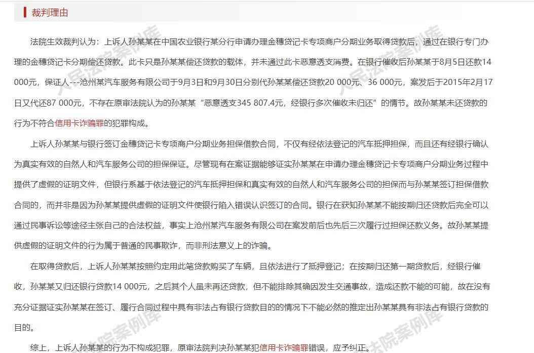 对此,二审法院也给出了具体理由,法院认为:尽管现有在案证据能够证实孙某某在申请办理金穗贷记卡专项商户分期业务过程中提供了虚假的证明文件,但银行系基于依法登记的汽车抵押担保和真实有效的自然人和汽车服务公司的担保而与孙某某签订担保借款合同的,而并非是因为孙某某提供虚假的证明文件使银行陷入错误认识签订的合同。银行在获知孙某某不能按期归还贷款后完全可以通过民事诉讼等途径主张自己的合法权益,事实上沧州某汽车服务有限公司在案发前后也先后三次履行过担保还款义务。故孙某某提供虚假的证明文件的行为属于普通的民事欺诈,而非刑法意义上的诈骗。