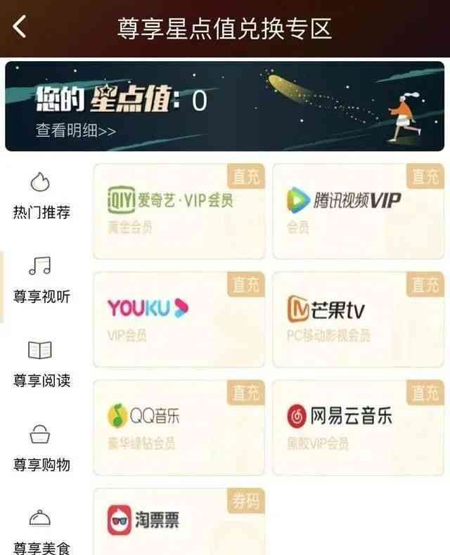 如果星级达标,则有对应权益五星级用户每月可以领取一个权益,类似浦发。主要包含视听会员券、美食券、出行、阅读、健康、话费等方面的权益。如果达标六星级,则可以享受星点值,星点值可以兑换更多优秀的权益。