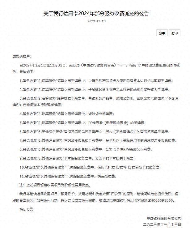 今日,中国银行发布《关于我行信用卡2024年部分服务收费减免的公告》,对部分信用卡服务费进行减免。减免项目包括中银系列产品持卡人使用自有资金进行柜台取现手续费、转账转出手续费、信用卡补发卡/损坏卡/提前换卡的服务费等,共计11项。中国银行表示,本次部分费用减免为阶段性费用优惠,时间为2024年1月1日至12月31日。