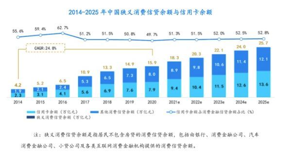 而据岭南金融研究院数据,信用卡行业经历了2014-2017年高速增长时期。2018年之后规模增长趋缓,进入存量经营时期。截至2020年,信用卡行业整体余额规模为7.9万亿,年均增速由2017年的36.9%下降至2020年的4.2%。