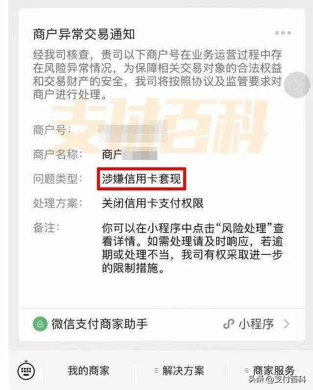根据商户向「支付百科」提供的图片来看,微信支付商家助手向部分商户发布了商户异常交易通知。在相关界面能看到商户号、商户名称、问题类型以及处理方案。