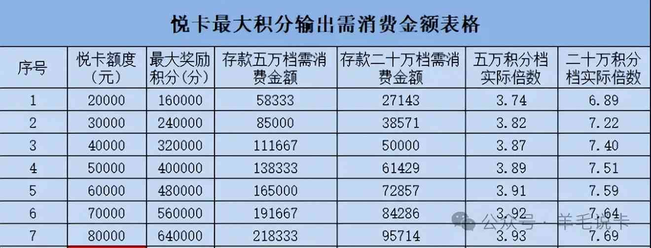 下表也总结了在不同固定额度下,要拿满月度最大积分奖励所需要的消费金额和实际倍数,月消费3w以上平均都有7倍积分了。