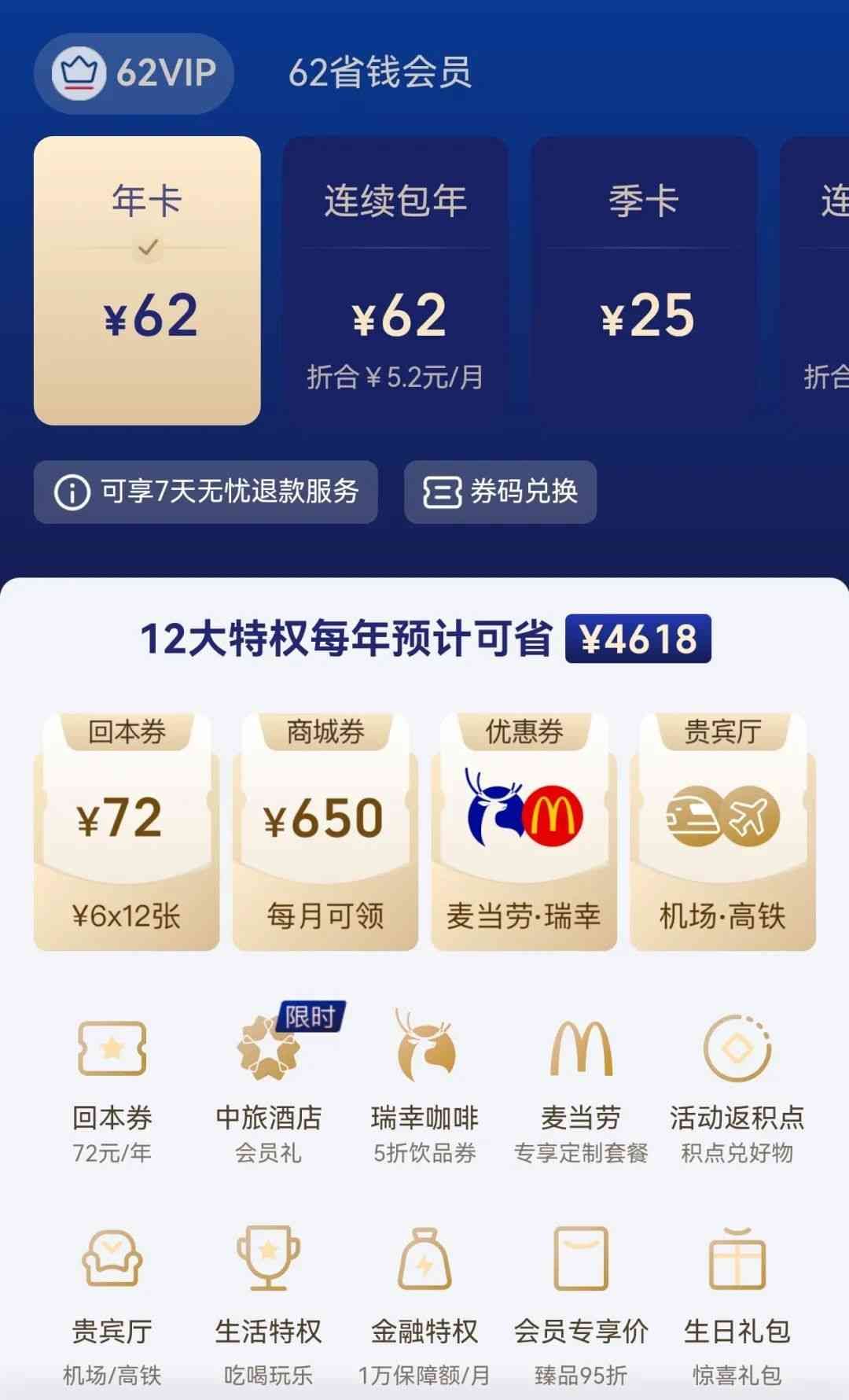 一年12个月,每个月省回6块钱,刚好把会员费抵完了。(所以叫“回本券”)