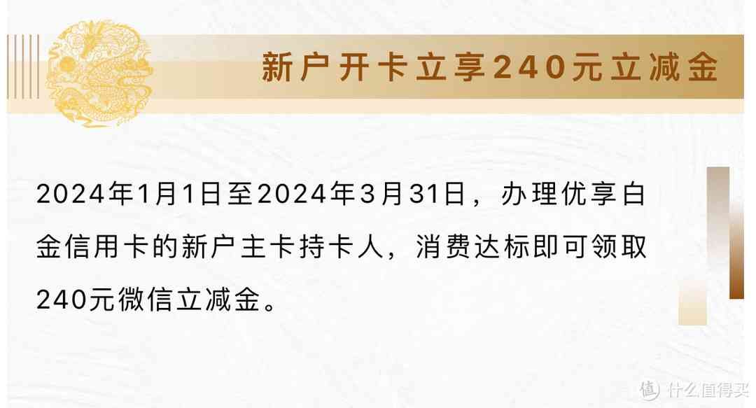立减金规则就是新户核卡90天内任意消费2笔99元(含)以上,即可通过权益平台领取价值240元微信立减金礼包,礼包含12张20元的微信立减金。