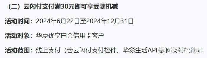 这样一来,新户首年年费相当于是440元,老户首年年费380元。但是别急,优享白现在有一个“云闪付随机减”活动:通过云闪付消费满30元就可以获得立减,每日限一次,最高88元,这个立减金比较厉害,一般最低都有一元多,立减几块钱也是司空见惯,这样一来,日积月累,每天几块钱,最后一年下来也能轻松到手三四百元,是不是就把首年年费给“立减”下来了?