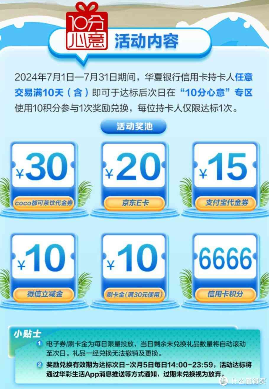 以上是首年年费的应对方法,次年年费需要5万积分或连续六个月累计交易五千元,毫无疑问是5万积分容易达到,这不,华夏的“10分心意”活动回归了。