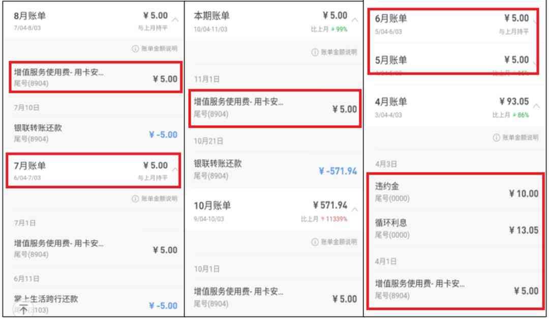 还有一名用户更加倒霉,他发现自己的信用卡被自动扣费长达4年,而且有一个月还因为5元钱“增值服务费”逾期未还,被招行收取了逾期违约金和循环利息!