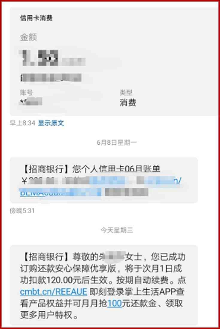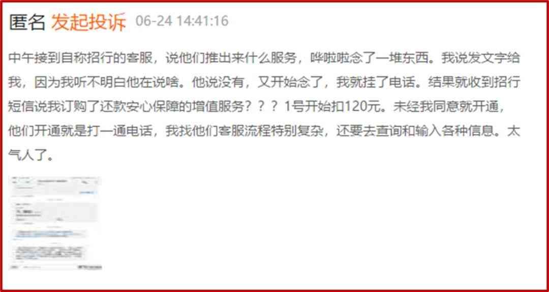 例如,用户B投诉称,他接到招行客户推销电话,听完后没听懂就挂掉了。没想到,不久就收到短信,招行帮他订购了“还款安心保障”增值服务,1号开始扣费120元,到期自动续费。