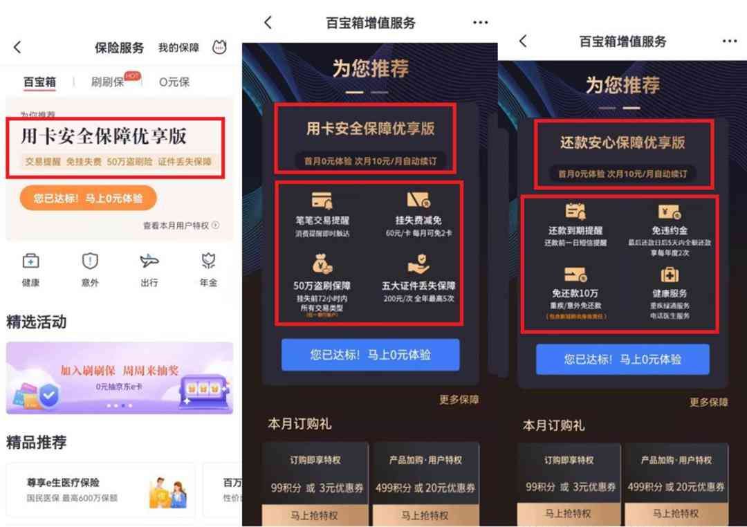 用卡安全服务包包括交易提醒;挂失费减免;50万盗刷保障;证件丢失保障等,收费为每月10元,自动续订。为吸引用户,首月给予0元体验优惠。