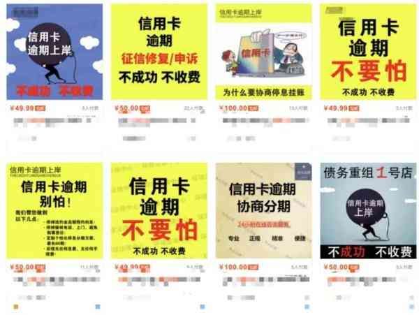 记者在电商平台上以“逾期协商”为关键词搜索,随后弹出一大串店铺,其中很多店铺的名字和介绍里有“法律中心”“信用卡逾期强制上岸”等字样。店铺商品的广告词基本雷同,含有“免息”“停催”“信用卡逾期别怕”等字样,价格从几十元到几千元不等。