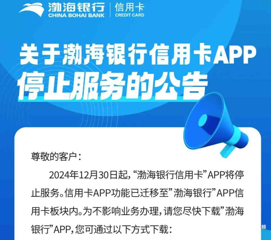 近日,渤海银行信用卡中心在官方微信公众号发布公告称,将于12月30日起暂停“渤海银行信用卡”APP的使用,信用卡APP功能转移至“渤海银行”APP信用卡板块内。