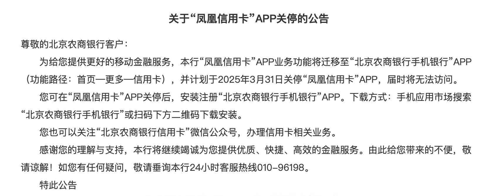 11月27日,北京农商银行在官网发布公告称,为提供更好的移动金融服务,该行“凤凰信用卡”APP业务功能将迁移至“北京农商银行手机银行”APP,并计划于2025年3月31日关停“凤凰信用卡”APP,届时将无法访问。