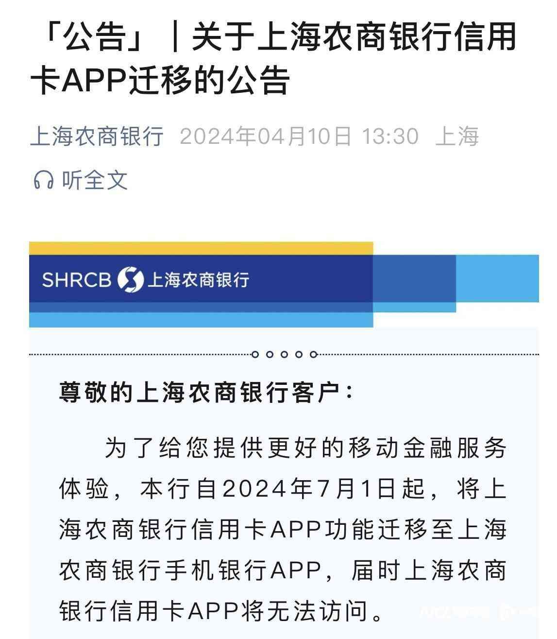 4月10日,上海农商银行在微信公众号发布的公告显示,于2024年7月1日起,将上海农商银行信用卡APP功能迁移至上海农商银行手机银行APP。