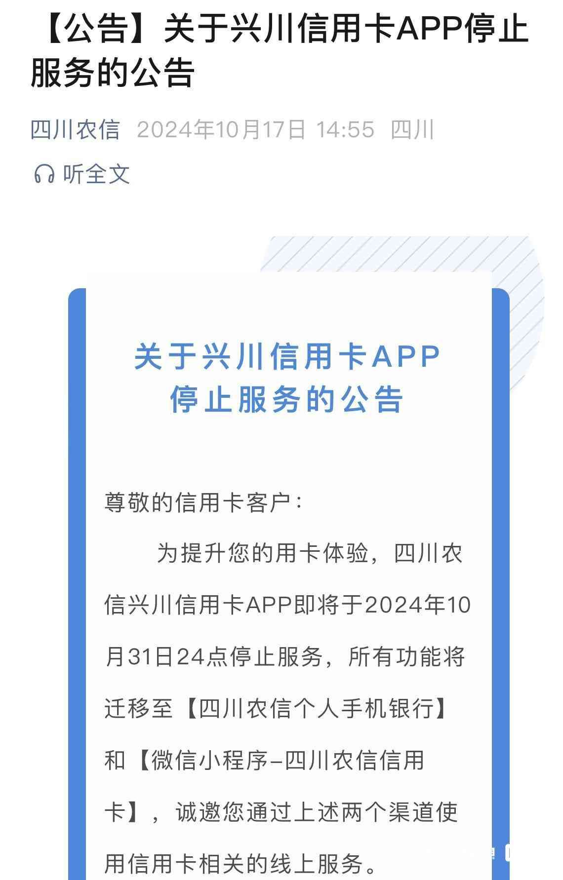 10月17日,“四川农信”官方微信公众号发布的公告显示,四川农信兴川信用卡APP即将于2024年10月31日24点停止服务,所有功能将迁移至“四川农信个人手机银行”和“微信小程序-四川农信信用卡”。