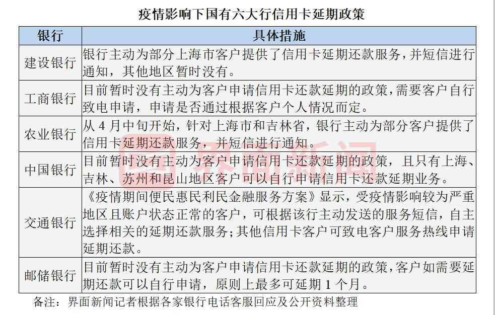 除了已明确会主动为特定地区客户申请信用卡延期还款服务的建行和农行外,工商银行、中国银行及邮储银行客服均向界面新闻记者表示,目前暂时没有该项政策。