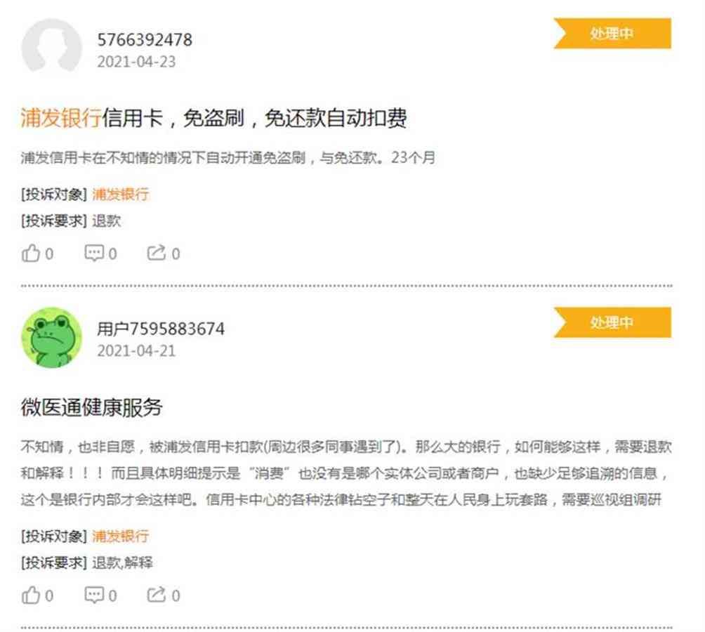 持卡人投诉时表示在未经自己许可的情况下,浦发银行擅自开通,要求银行提供开通录音,工作人员没有提供,不过表示经过客户同意才开通的。在黑猫投诉平台,其他银行的投诉只有几百到几千不等,问题则多为持卡人逾期后对银行催收、协商减免等不满。