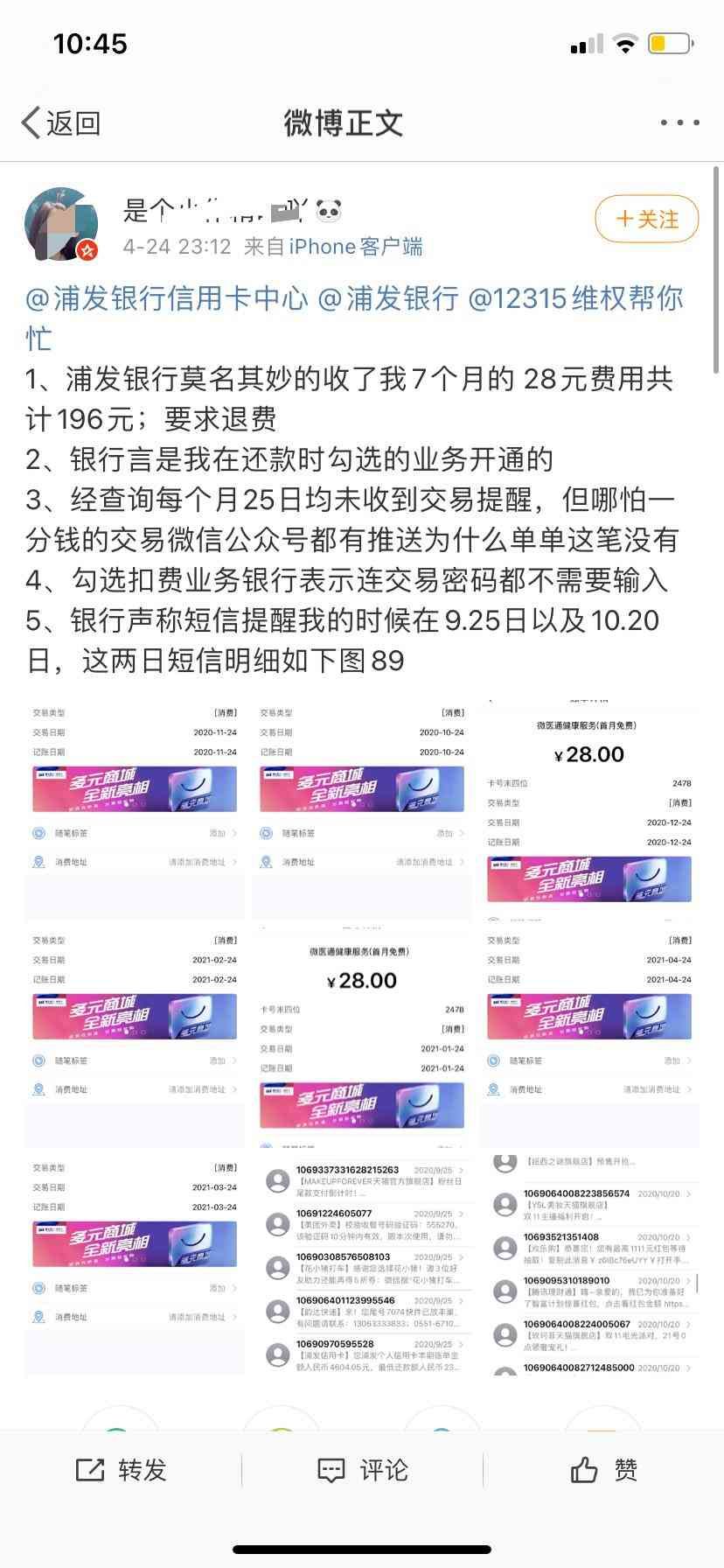 另外一名微博网友反映,浦发银行莫名其妙收了她7个月的费用,每月28元,共196元,银行声称是在她还款时勾选的业务开通。她经过查询发现,每个月25日并未收到交易提醒,她质疑为何没有推送交易提醒,勾选扣费业务为何连交易密码都不用输入。而银行客服声称的9月25日和10月20日曾短信提醒过她,她提供的当日手机短信截图,均显示没有收到提醒。