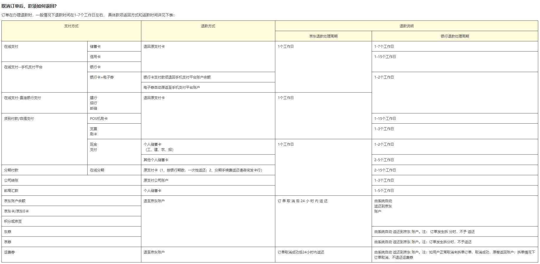 京东款项退回说明中明确显示,在线储蓄卡支付、信用卡支付京东退款处理周期为1天,银行退款处理周期分别是1-7个工作日、1-15个工作日,退还方式均为退回原支付卡。