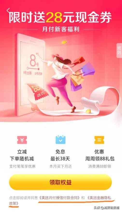 除了部分用户会在不知情的情况下“被”开通月付功能,在其它方面,美团月付也被外界所诟病。在月付开通界面当中,“领取权益” 按钮下方有两个文件,一个是《美团月付授信付款合同》,另一个是《美团金融隐私政策》。