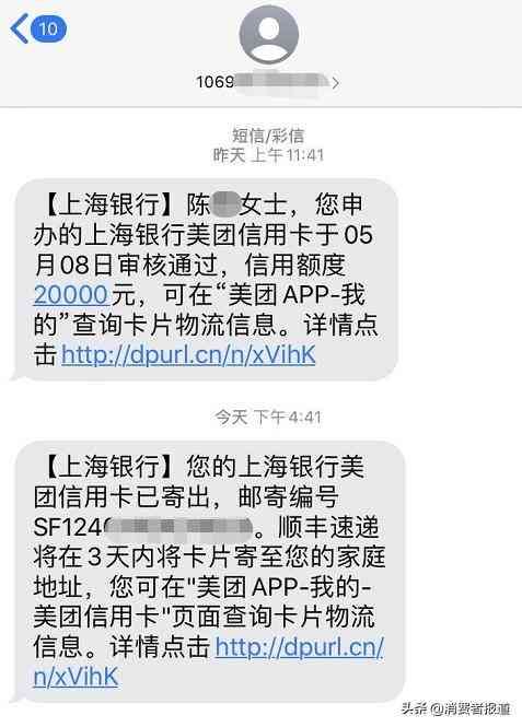 然而很快,陈女士就接到一条上海银行发来的短信,称她申请办理的上海银行美团信用卡于5月8日通过审核,信用额度为2元。