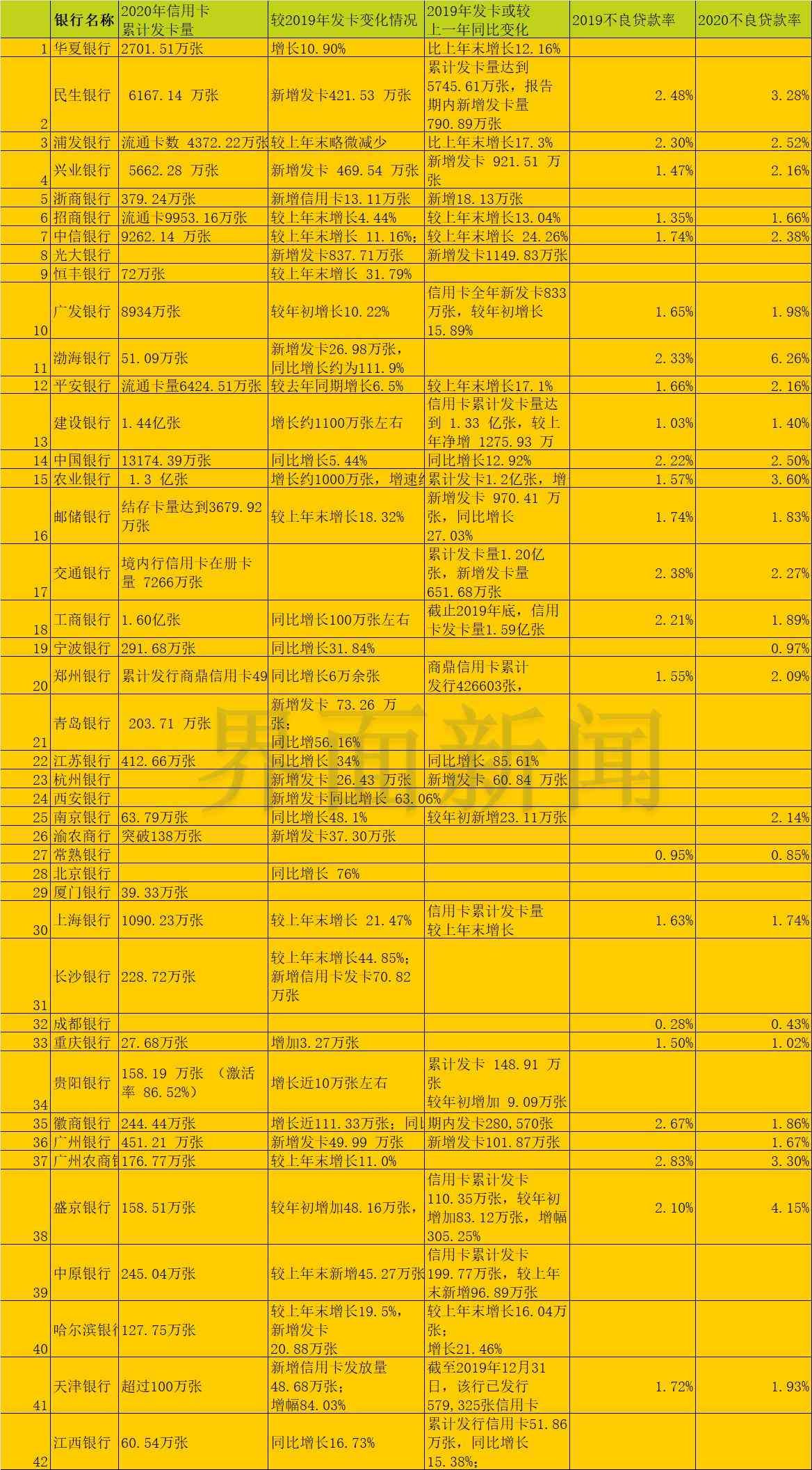 根据界面新闻记者统计,从信用卡发卡量来看,相比于2019年,基本上所有银行在发卡量增速上均有所放缓。