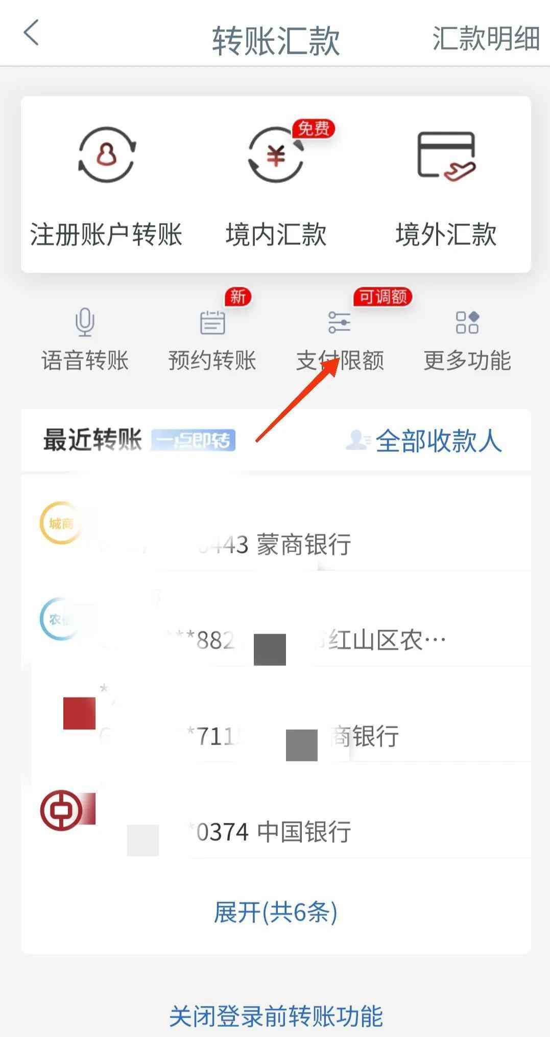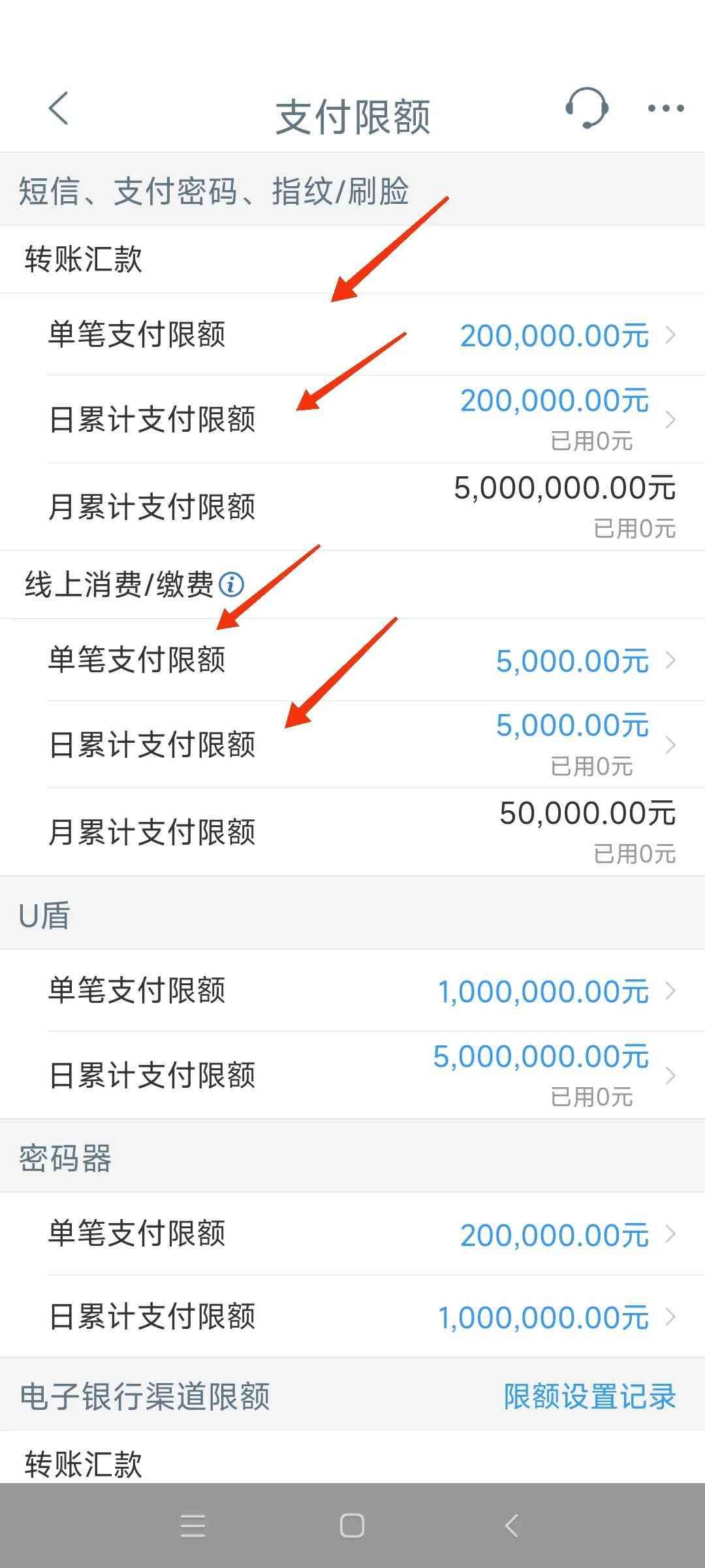 点击进入后,可调整转账汇款或者是线上支付的单笔限额和日累计限额,点击相应的>进去,选择页面提示的最高限额,按页面提示操作,刷脸认证可调整成功。