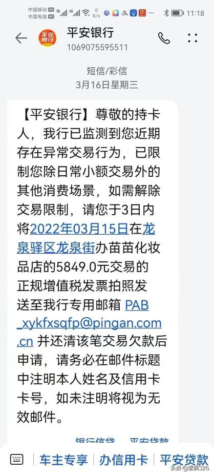 平安银行最近开始大规模的发送短信要求持卡人提供近三个月的交易的发票,很多人去消费,很少会要发票,不能提供发票就会出现风控,不能大额交易,只能5以下的小额度交易,这就让很多人蒙圈了。