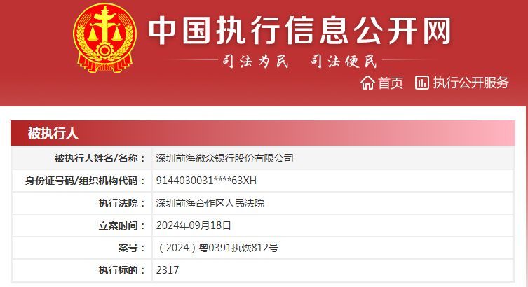 不巧的是,几乎同一时间,深圳前海合作区人民法院也公布一则信息,微众银行被该法院列为被执行人(立案时间2024年9月18日),执行标的金额为2317元。