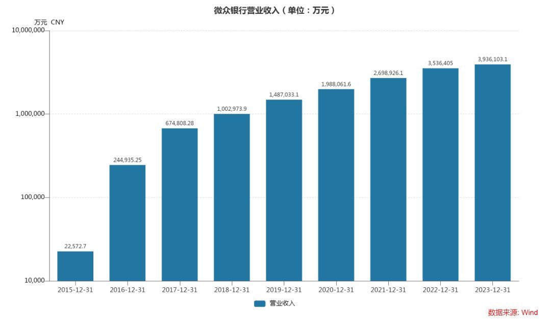 2023年末,招商银行零售客户数为1.97亿户,同期末微众银行个人客户数为3.99亿户,是前者的两倍有余。
