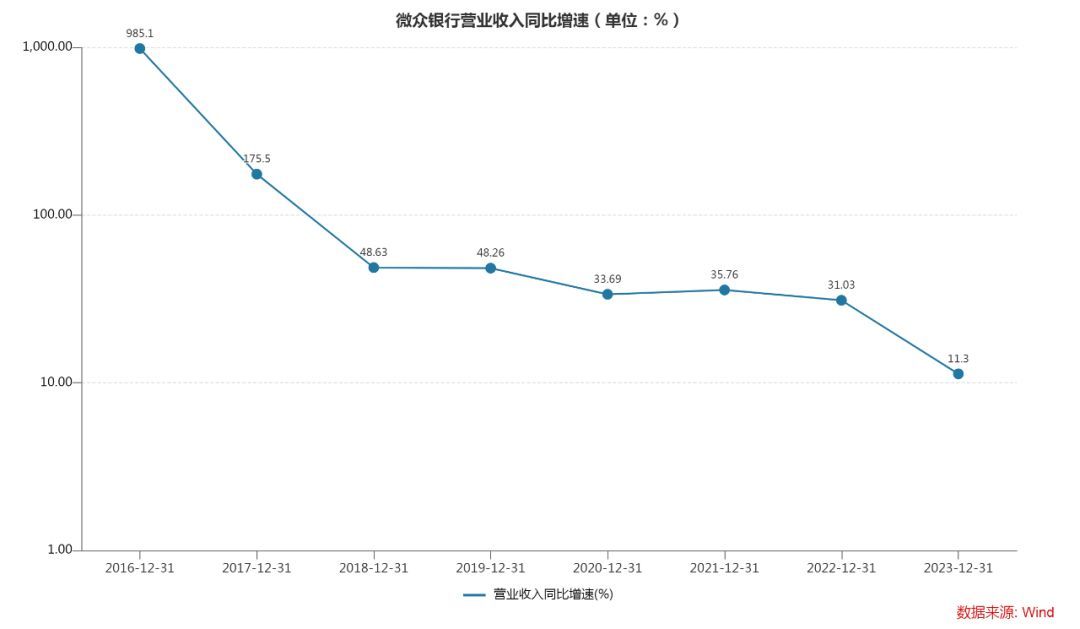 2023年,微众银行实现营收393.61亿元,同比增长11.3%。这一增速虽在银行业中不算差,但较之自身前几年动辄30%起步的营收增速,已然相去甚远。