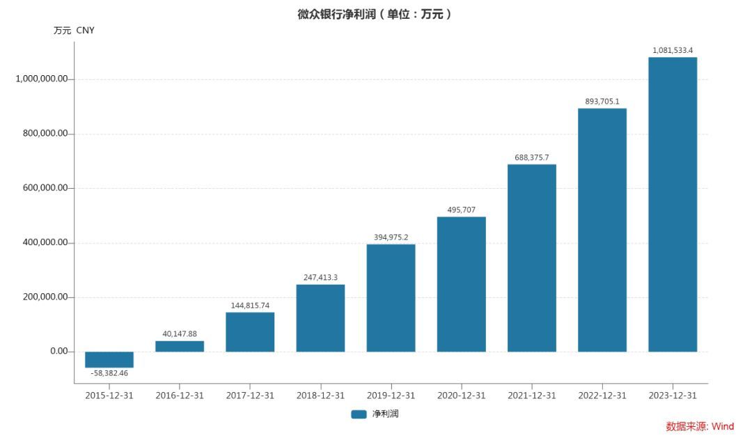 这些普罗大众,虽然为微众银行贡献的户均利润不高(2023年仅为28元),但奈何群体规模庞大,近4亿的客户数量,直接撑起了微众银行高达108亿元(2023年)的净利润。