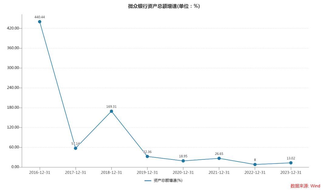 对应在资产规模的增长上,截至2023年末,微众银行总资产为5356亿元,较上年末增长13%。增幅较上年有所提升,但亦不及该行过往的增长水平。
