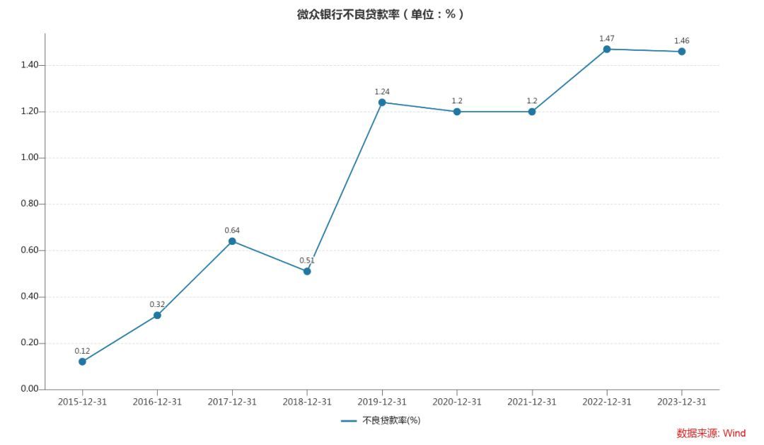 自此之后,截至2023年末,微众银行的不良贷款率为1.46%,较上年末下滑0.01个百分点,但依然维持在该行历史高位。