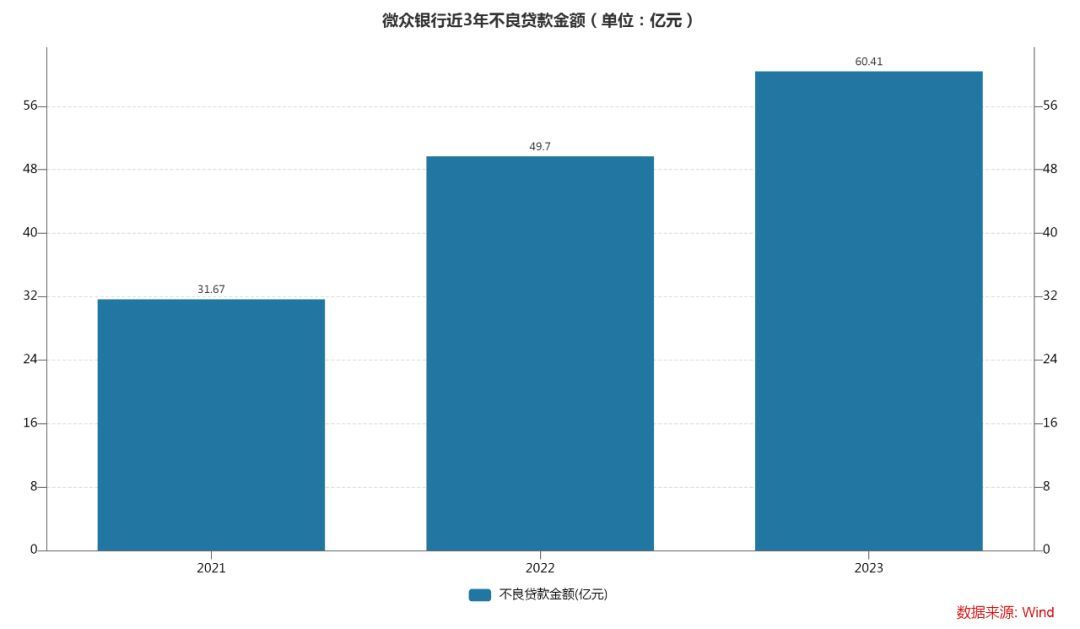 与之对应的是,近两年来,微众银行的不良贷款金额也在攀升。2021年至2023末,该行不良贷款金额分别为31.67亿元、49.7亿元、60.41亿元。