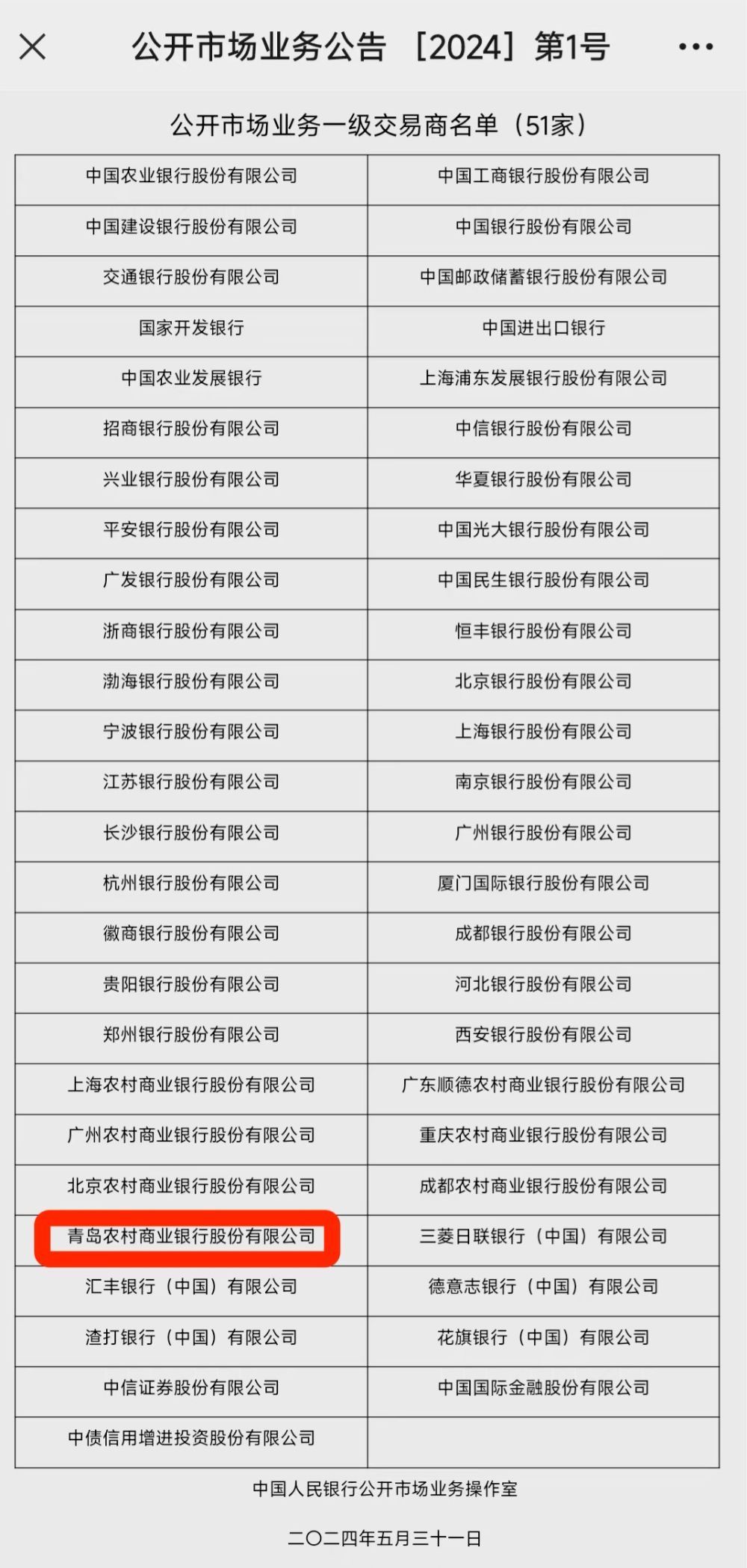 对比2023年公开市场业务一级交易商名单,总数没有发生变化,仍维持在51家。值得注意的是,今年青岛农商银行成功跻身公开市场业务一级交易商行列。
