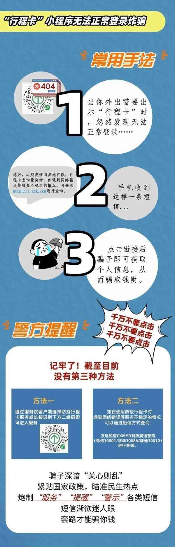 骗子自称防疫部门工作人员致电做过核酸检测的市民,称其检测结果有问题。但如果市民未去过中高风险地区,也未接触过风险人群,骗子会以系统问题,要求重新核实身份信息和行程信息,并发送相关链接。市民点击链接填写完身份证信息和电话号码后,会收到一个验证码。骗子会以要这个验证码重新办理行程码为由,将市民银行卡里的钱骗走。